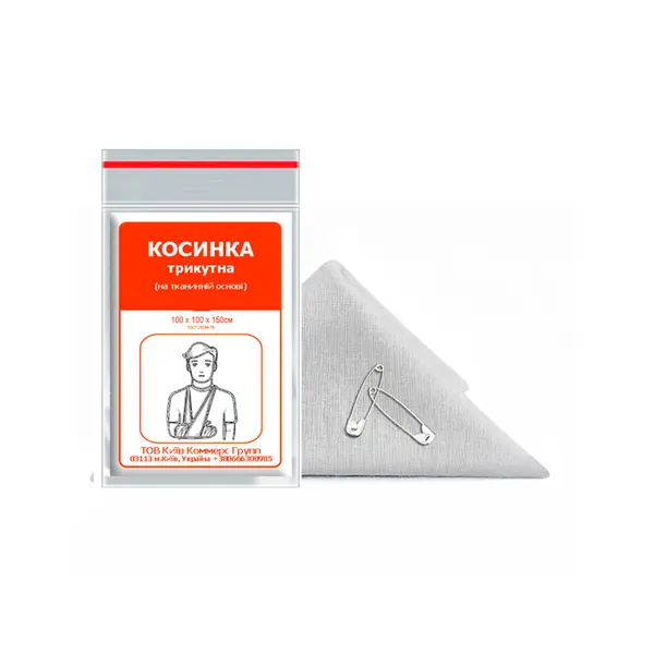 A triangular scarf is used for dressing wounds, immobilizing fractures and sprains, as a bandage to support the damaged part of the body, and also to protect the injury from external influences. The scarf is individually packaged in a set with two safety pins to facilitate its fixation. It is easily placed in any first-aid kit or pocket and is an indispensable product for basic dressing or applying a splint.