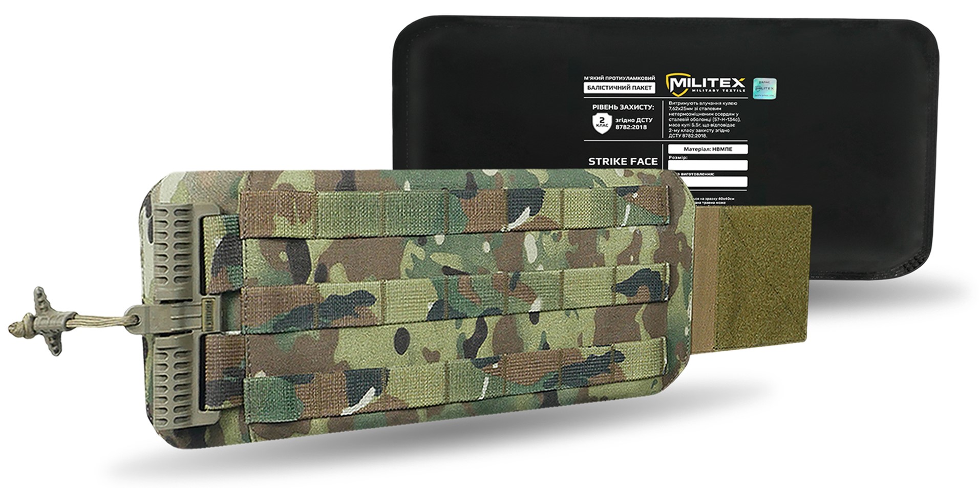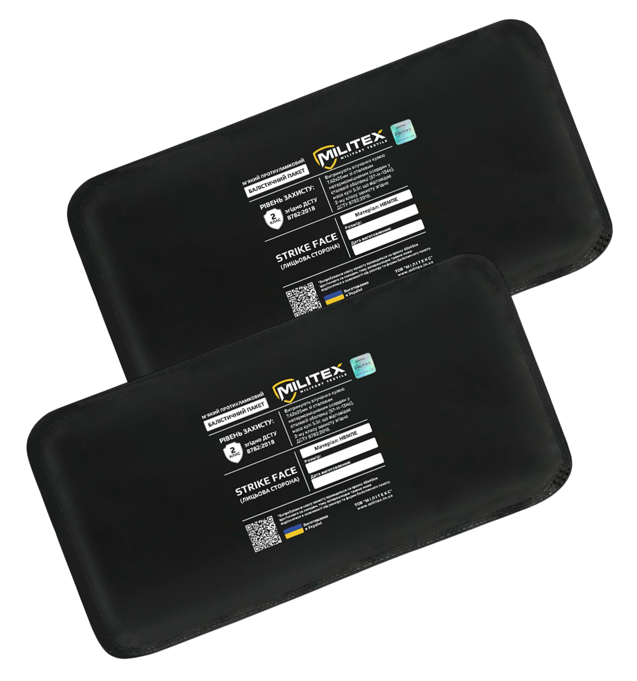 - 2 × балістичні пакети Militex (2-й клас) — розмір 30,5 × 13,5 см (вже вкладені у внутрішні кишені)