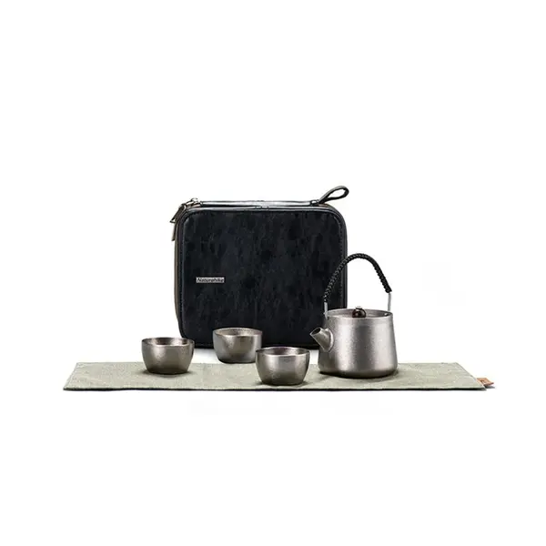 Основними складовими набору є чайник (250 мл) та 3 чашки (по 40 мл). Посуд виготовлений з титану, який цінується за високу міцність та несприйнятливість до корозії. До інших важливих переваг титану належать стійкість до впливу високих температур та безпека при контакті з харчовими продуктами та рідинами, що дозволяє насолоджуватися унікальним смаком та ароматом улюбленого гарячого напою, де б ви не знаходилися.