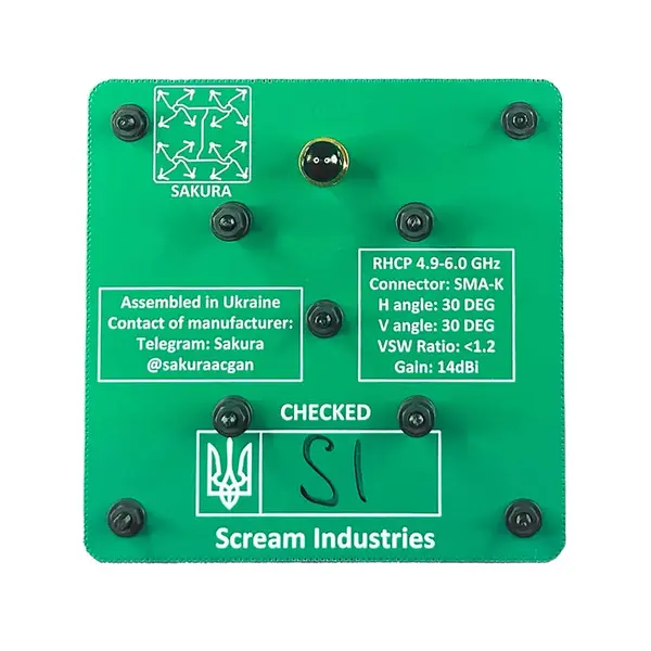 Компактна спрямована патч-антена Scream Industries 5.8 GHz 14 dBi RHCP із шириною променя 29° забезпечує стабільний сигнал у діапазоні 4.9–6.0 GHz на дистанціях до 25–30 км. Антена створена для професійних FPV-польотів, телеметрії та комунікаційних систем.