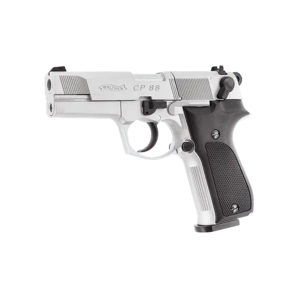 Спусковий механізм подвійної дії дозволяє вести стрільбу як самовзводом, так і з попереднім зведенням курка, що підвищує контроль і точність. Завдяки металевому корпусу, збалансованій вазі та нікельованому покриттю Walther CP88 не лише приємний у використанні, а й має ефектний зовнішній вигляд.