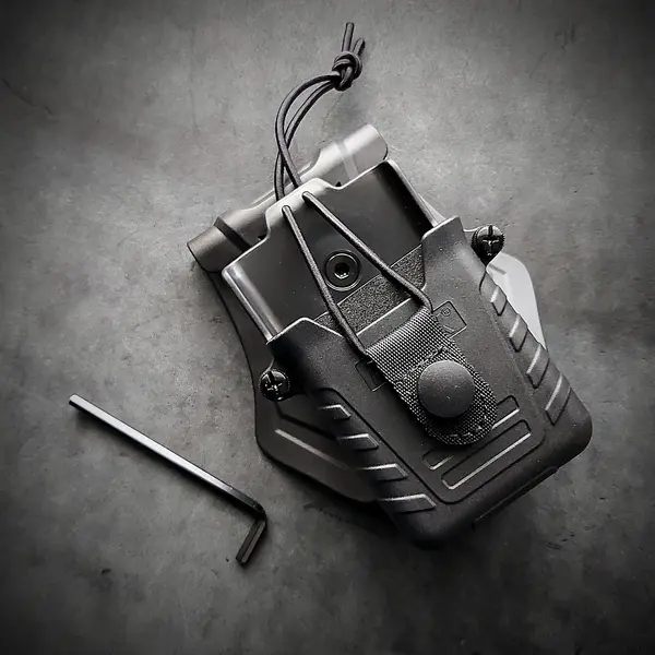 Поясной чехол для рации Amomax выполнен из прочного чёрного пластика. Фиксатор на ремень 5 см шириной регулируется по углу наклона. При необходимости поясной фиксатор можно заменить на адаптер Molle. Чехол регулируется по ширине, фиксирует рацию на кнопку.